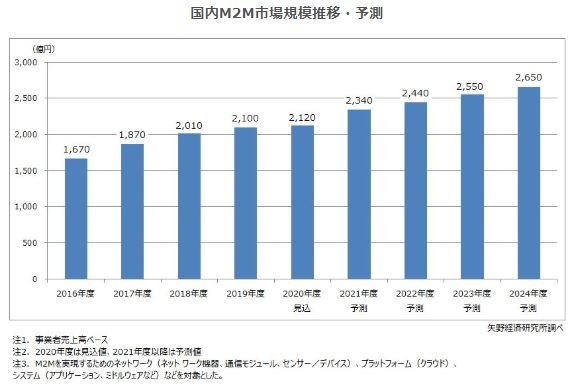 2020年度上期はコロナ禍により新規受注にブレーキが掛かったことや、LTE対応の通信モジュール需要が一巡したこともあってマーケットの勢いは鈍化しており、2020年度のM2M市場規模(事業者売上高ベース)は、前年度比1.0%増の2,120億円を見込む。