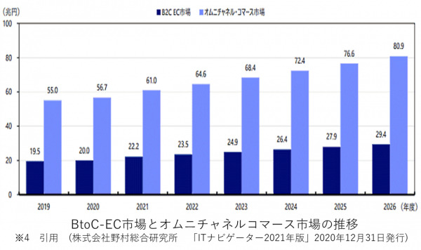 株式会社野村総合研究所が発表したICT(情報通信技術)やメディアに関する市場調査レポート「ITナビゲーター2021年版」によると、『「BtoC EC(消費者向けEC)」の2026年度の市場規模は29兆4000億円、オムニチャネルコマース市場は80兆9000億円市場に拡大する』と予測しています。※4