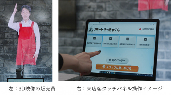 「リモートせっきゃくん」は、ITと3D映像、2D映像を活用した双方向性のある接客システムです。店内に設置した専用機材に、店外にいる販売員の3D映像などを投影し、対面販売と同様の接客がおこなえます。またECに誘導することでリアルな体験とECを連動させるオムニチャネル・コマース※1の展開が可能になります。