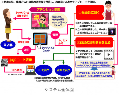 「リモートせっきゃくん」は店頭で利用されていない時は、常に3D(または2D)動画を流し、積極的に来店客の呼び込みを行います。その呼び込み用の動画はABテスト※3を繰り返すことで、利用者の興味を惹きつけ、まずはタッチパネルに触れてもらうことに注力します。タッチパネルと動画を映す機材を、2つに分けることにより、タッチパネルがよりシンプルになり誰でもわかりやすい設計になっています。それに加えて、半自動接客時のシナリオは、利用者の反応や利用率、購入率などのデータを蓄積し、データ分析を行うことでより反応の良いコンテンツへとPDCAを繰り返して販売促進を効率化し、購入またはECへと導きます。