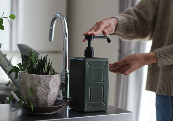 今回、発売する【MOLDING ALCOHOL DISPENSER】はジェリカンをモチーフにした、メンズライクなデザインが特徴のアルコールディスペンサーです。容量が1000mlとたっぷり入るので、たくさんの方が使用するオフィスのエントランスホールや店舗の入り口に設置しても、すぐに無くなる心配がありません。また、ノズルロックが出来るのでキャンプに行く際、持ち運びが可能なところも魅力の一つです。毎日使うからこそ、選びたい。生活の中にそっと溶け込むようなデザインで日々の生活を豊かにお過ごしください。