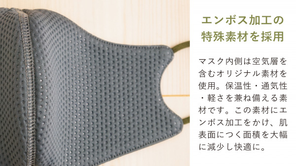 マスク内側は空気の層を含む弊社のオリジナル素材「AIR PUFF」を使用しています。