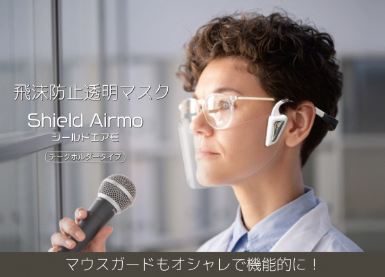 「シールドエアモ」はチークホルダータイプで顔の前面にフレームが掛からないため着けていることを忘れるほどの自然な装着感で、見た目もとてもスタイリッシュです。