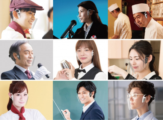 マスクによる対面でのコミュニケーションでの不自由さを解消しながら発声も聞き取りやすく、講演会・セミナー・プレゼンテーション・冠婚葬祭・催事・飲食等の対面接客など、対面コミュニケーションを必要とする様々な場面でご活用いただけます。