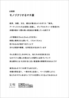 日本出版販売株式会社(代表取締役社長:奥村 景二、略称:日販)および株式会社リブロプラス(代表取締役社長:玉井 俊也)が運営する本屋「文喫」は、2021年1月19日(火)~2月23日(火)の期間中、江東区と共同の企画展「モノヅクリするマチ展」を開催します。