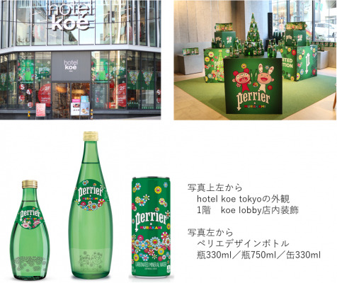 『ペリエ』の村上隆氏デザインのボトルは、2021年5月頃まで数量限定で販売予定です。今回のhotel koe tokyoでの企画中、ホテル外観、及びkoe lobby店内にはデザインボトルをイメージする装飾がおこなわれます。世界で最も高名な現代アーティストの一人である村上隆氏の描いた人気のキャラクターと『ペリエ』の共演を楽しんでいただけます。