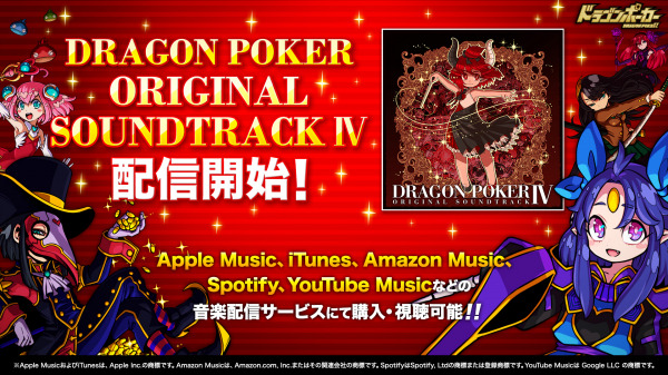 株式会社アソビズム(本社:東京都千代田区、代表取締役:大手智之)は、App Store・Google Playにて配信中のリアルタイム合体カードバトル『ドラゴンポーカー』の第4弾となるオリジナルサウンドトラック(以下、サントラ4)を、2021年1月15日(金)より配信を開始いたしましたので、お知らせいたします。