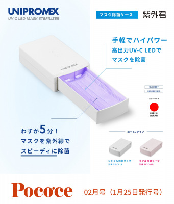 医療機器のOEM/ODM生産(相手先ブランドによる製品の開発・製造)を手掛ける、太洋工業株式会社(本社:神奈川県川崎市、代表取締役:佐野仗太郎)が自社ブランド「UNIPROMEX」(ユニプロメックス)を立ち上げ、新型コロナウイルス感染症対策商品として開発した持ち運びできるマスク除菌ケース「紫外君」が、1月25日発行の “ 東京都心で働く女性たち ” に向けた、活用型ライフスタイル誌「ポコチェ」の巻頭特集「季節に負けないカラダをつくる」に掲載されることが決定しました。片面ずつ除菌する「シングル照射タイプ」と、両面を同時に除菌する「ダブル照射タイプ」の2種類が特集記事内で紹介されます。(※巻頭特集のタイトルは編集の都合上、変更される場合があります。)