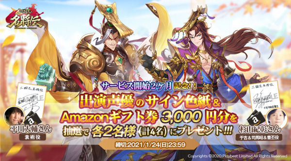 公式Twitterアカウントをフォローし、対象のキャンペーンツイートをリツイートいただいた方から抽選で各2名様(計4名様)に『于吉』&『司馬昭』&『曹丕』役の杉山紀彰さん及び『袁術』役の平川大輔さんによる、直筆サイン色紙をプレゼントいたします。