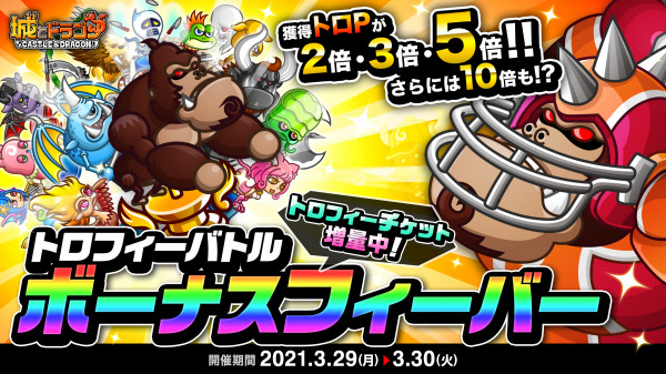 株式会社アソビズム(本社:東京都千代田区、代表取締役:大手智之)は、App Store・Google Playにて好評配信中の『城とドラゴン』で、「トロフィーバトル ボーナスフィーバー」を2021年3月29日(月)より開催いたします。