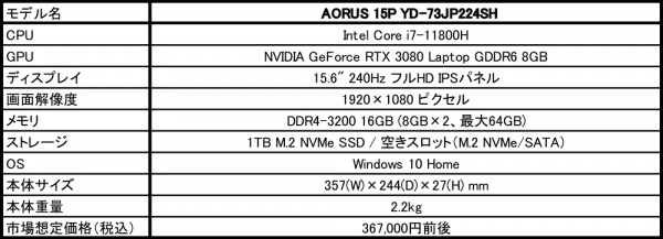 AORUS 15P YD-73JP224SHの主な仕様は以下のとおりです。