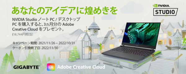 本キャンペーンの対象製品は、NVIDIAのRTX Studioに準拠した、GeForce RTX 30シリーズGPU搭載のAERO 15、AERO 17、AERO 15 OLED、AERO 17 HDRの各シリーズ。クーポンコードの引き換え期間は、2022年11月30日まで。なお、クーポンコードが予定数に達した場合、期間中でもキャンペーンを終了する場合があります。対象機種やクーポンコードの引換方法などキャンペーンについての詳細は、キャンペーン情報ページをご参照ください。