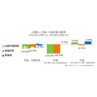 エヌピーディー・ジャパン、最新外食・中食レポート「2021年11月の市場動向、外食・中食売上は2019年同月比12.0%減、出前(デリバリー)は2019年同月比82%増 」を公表
