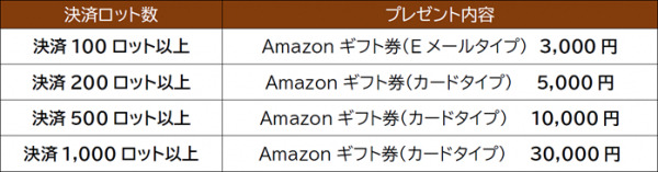 期間中の決済取引ロット数に応じて、Amazonギフト券(最大3万円分)をもれなくプレゼントいたします。