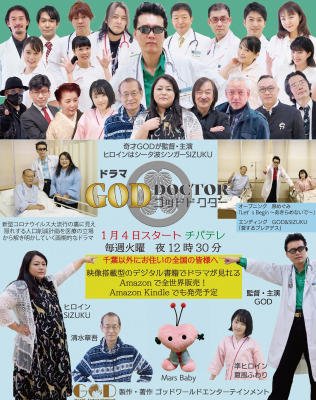 株式会社ゴッドワールドエンターテインメントが製作する痛快!!連続医療ギャグドラマ「GODドクター」がいよいよ本日放送開始となります。本ドラマはGODが監督・主演、シータ波シンガーSIZUKUがヒロインを務め、医療業界の闇を暴くGODドクターの奇想天外なリアルとギャグが交差するテロップ方式のドラマで、音楽や効果音なども凝っていて、ドラマ業界初パロディーフィクションという新ジャンルを築いています。沢山の現役医療従事者も出演します。また、体調を崩し俳優業を休止していたベテラン俳優、清水章吾が本ドラマで本格復帰します。放送は本日2022年1月4日(火)24:30~チバテレにて。