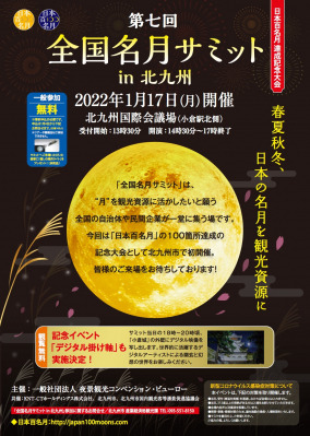 一般社団法人 景観光コンベンション・ビューロー(代表理事・丸々もとお)は、2022年1月17日(月)、福岡県北九州市・北九州国際会議場において「第七回全国名月サミット in 北九州」~「日本百名月」達成記念大会~を開催します。本サミットは、“月”を観光資源に活かしたいと願う全国の行政・民間企業が一堂に会する場です。「月の魅力」を時代に即した観光視点から捉え、より強い日本の夜景資源へと昇華させること目指しています。