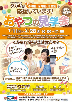弊社では、この受賞を機に、地域に一層貢献したいと考え、地元京都の幼稚園・保育園・児童館様を対象に、「おやつ見学会」を実施することとしました。日頃から忙しい幼稚園や保育園、児童館の現場では、新型コロナ対策で、より先生・職員方の負担が増している現状です。「おやつ見学会」では、そんな現場の「悩み」をうかがい、おやつ調達がより楽になるサービスの充実を図るとともに、子どもたちが笑顔になるような、新しいおやつの提案をさせていただきます。もちろん感染防止対策を十分に行った上でのご試食も可能です。