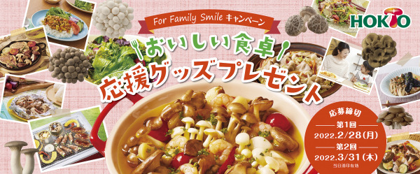 きのこ総合企業のホクト株式会社(所在地:長野県長野市、代表取締役社長 水野雅義)では、家族で笑顔になっていただこうと「おいしい食卓応援グッズプレゼント」キャンペーンを開催します。期間は2022年1月1日[土]から3月31日[木]まで。