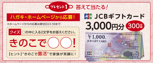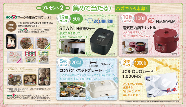 クイズに答えて当たるコースでは、JCBギフトカード3,000円分が300名様に。また、ホクトのきのこのパッケージに付いているHOKTOマークを必要枚数分集めて応募するコースでは、「象印 STAN.IH炊飯ジャー」が50名様に。「アイリスオーヤマ 電気圧力鍋3リットル」が100名様に。「BRUNO コンパクトホットプレート」が200名様に。「JCB-QUOカード1,000円分」が1,000名様に当たります。