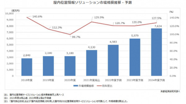 今後の市場展望としては、2021年度の屋内位置情報ソリューション市場(事業者売上高ベース)で41億3,000万円の見込みに対して、2022年度は前年度比120.7%、49億8,300万円になると予測する。また、2024年度にはさらに前年度比127.5%の76億2,400万円になると予測する。ただし、この間の成長スピードは分野によって若干異なる見通しである。