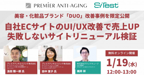 美容・化粧品ブランド「DUO」を運営するプレミアアンチエイジング株式会社の汲田さま、田中様をゲストに、当社が独自開発するアクセス解析ツール SiTest(サイテスト)の活用も踏まえて、自社ECサイトで行ったアクセス解析によるボトルネック発見、サイトリニューアルの成功事例・検証のコツを公開。