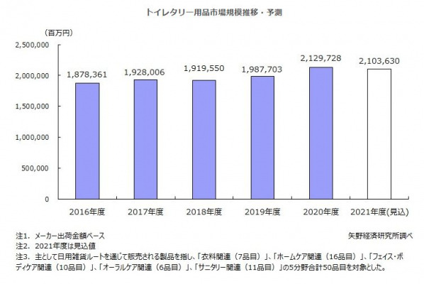 2020年度のトイレタリー市場規模(メーカー出荷金額ベース、5分野50品目)は、前年度比107.1%の2兆1,297億2,800万円と2兆円を突破した。参入各社が高付加価値製品の販売を強化することで購入単価アップさせて収益を確保する戦略が浸透、市場拡大につながっている。さらには新型コロナウイルス感染症予防対策としての衛生関連商品や、外出自粛や在宅ワークのシフトによる在宅起点のライフスタイルで生じる巣ごもり消費、家事炊事に必要なトイレタリー商材の需要拡大など、コロナ禍での特需品目がトイレタリー市場の拡大に寄与した。