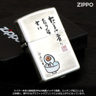 水木しげるが描いた何枚かの色紙の中から、名言として知られる一言をZIPPOに。人間らしい温かみのある言葉とサインを配したデザインは、ZIPPOライターというメタルキャンパスを色紙に見立て、永くファンと共に生き続けるようにと思いを込め製作いたしました。