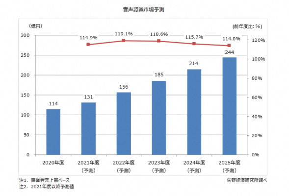 音声認識市場は、2022年度以降も好調を維持する見通しである。2020年度から2025年度までのCAGRが16.4%で成長し2025年度には244億円に達すると予測する。