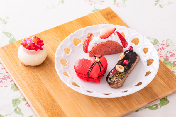 「ハートのマカロン クリームチーズ&ラズベリーチョコレート」(写真プレート左)