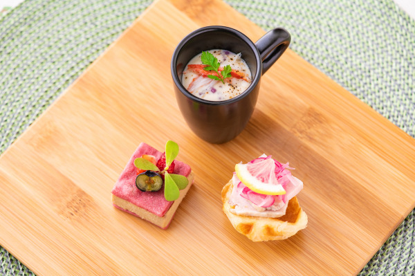 一見デザートのように華やかな「フォアグラのベリークッキーサンド ガトー仕立て」は、ポートワインでマリネしたフォアグラを、ラズベリー風味のクッキーでサンドしたセイボリーです。酸味の効いた「クロッフルのオープンサンド パン・コン・チチャロン風」や、柚子胡椒のジュレを忍ばせた「柚子香るぶり大根」など、甘いデザートを引き立てるシェフこだわりのセイボリーをご堪能ください。