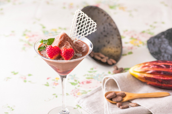 香り豊かなココアと、甘酸っぱい苺のピューレを合わせました。甘さ控えめで、さっぱりとした後味のフローズンチョコレートドリンクです。トップに飾ったハート形の苺が、バレンタインやホワイトデーシーズンにぴったりです。「ストロベリー&チョコレート アフタヌーンティー」限定、追加オーダーにてご提供します。