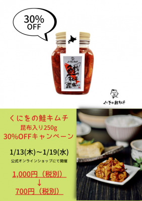 くにをの鮭キムチ昆布入り250gを1/13(木)12:00PM~1/19(水)期間限定で30%OFF(税、送料別)で販売いたします。