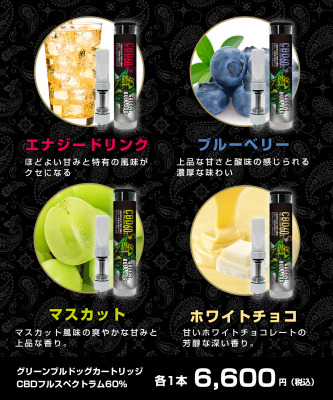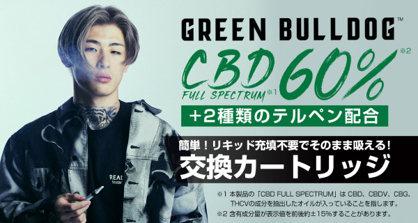 株式会社GREEN WAVE UNLIMITED JAPANが展開するCBDブランド【GREEN BULLDOG】(グリーンブルドッグ)からこの度、CBDフルスペクトラム60%*の「エナジードリンク」、「ブルーベリー」、「マスカット」、「ホワイトチョコ」フレーバーのカートリッジタイプを2022年1月13日(木)より発売いたします。