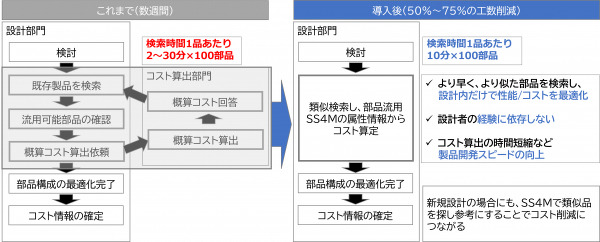 このような課題を解決するために、類似形状検索システム「SS4M」を導入しました。「SS4M」により、素早く部品を検索し、部品に紐づいたコスト情報から概算コストを高速で算出することで、製品開発スピードの向上を実現することが狙いです。
