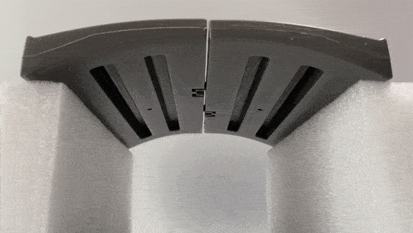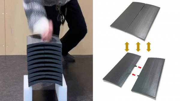 上方向からの力が加わると中心部にある左右のプラカワラを結合している2つの突起が下方向へ抜ける構造により奇麗に割れる仕組みになっています。