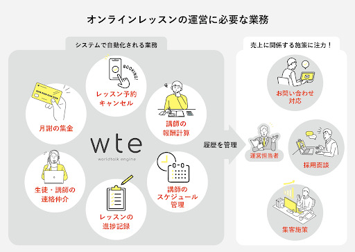 WTEはオンラインレッスンを立ち上げたいと考える企業様に対し、事業運営を円滑にするためのシステムをパッケージ化しています。