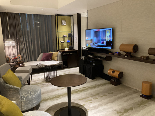 このようにホテル全館をスピーカーのショーケースに見立て、その音を実感できる試聴ルームは世界でも初めてかも知れません。