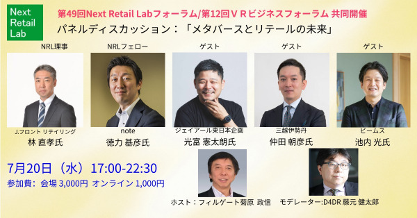 近年、「メタバース」と言われる仮想空間が話題になっています。そこで今回は、VR・ARの分野で活動している株式会社VRデザイン研究所様と共同でフォーラムを開催します。2部構成として、第1部はVRビジネスフォーラム「2016年VR元年から6年、大躍進の先駆者からXRビジネス成功と失敗事例~2022年から2030年メタバースへの8つの階段」、第2部は「メタバースとリテールの未来」をテーマにパネルディスカッションを行います。