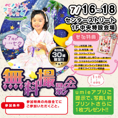 デザイナーが季節に合わせてデザインした背景でプロカメラマンが撮影するベビー&キッズの無料撮影イベントです。「七夕」の背景で無料で撮影、L判写真2枚と2L判写真1枚をプレゼント。季節に合わせたスクラップブックも差し上げます。さらに気軽にオンラインで参加できる、お子様の未来を考える「子育てライフプラン相談会」を開催いたします。(後日開催)