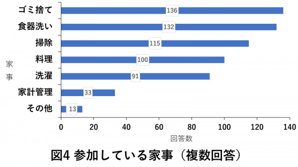実際に参加している家事の内容について、「家計管理」「その他」以外回答が多く、特に「ゴミ捨て」を選択された方が多い結果となりました。