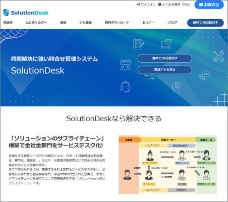 当サイトでは、SolutionDeskの製品概要、特長、用途別活用シーン、デモ動画、セミナー情報、関連ブログなど様々な情報をご覧いただけます。導入前のよくある質問と、製品サポートにおけるよくある質問をまとめたFAQは、SolutionDeskの機能を利用して公開しています。