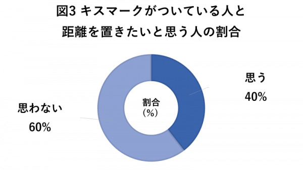 結果、「思う」と回答した方が40%に対し、「思わない」と回答した方は60%を占めていました。キスマークをつけている人と距離を置きたいと思わない人の方が多い傾向にあることが見てとれました。
