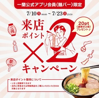 【イベント名】一蘭公式アプリ 来店ポイント2倍キャンペーン