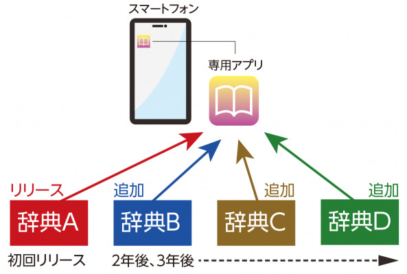 例えば、出版社様専用アプリを開発し、収録する辞典Aを最初にリリースします。