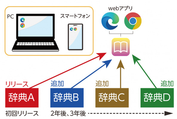 例えば、Webアプリを開発し、収録する辞典Aを最初にリリースします。
