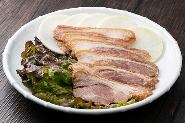 豚肉の珍しい部位「豚肉皮付きスネ肉(ちまき)」の血合いや余分な脂肪を取り除き数回茹で、明(ミョン)家に伝わる秘伝の調味配合でじっくり煮込んだコラーゲンたっぷりの豚肉料理です。