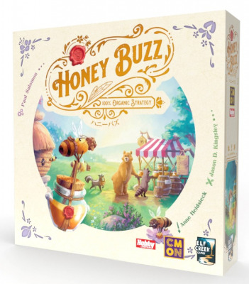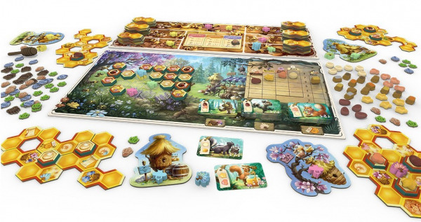 ●内容物:ハチの巣ボード1枚、森ボード1枚、働きバチ駒40個、蜜探しトークン4枚、扇トークン4枚、プレイヤーボード4枚、プレイヤーエイド4枚、初期ハチの巣タイル16枚、コイン60枚、通常ハチの巣タイル63枚、花蜜タイル24枚、花粉15個、蜂蜜28個、スタートプレイヤーマーカー1枚、注文カード26枚、女王の競技会カード24枚、配置カード17枚、雄バチ駒2個、雄バチカード10枚、ルールブック1冊