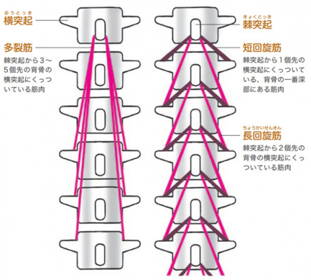 イラストの示すように、「短回旋筋」は、体幹部の最も深部にあり、背骨と背骨の間についている。