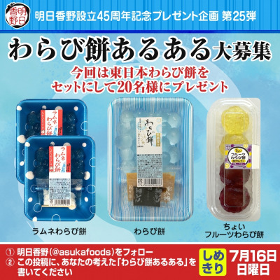 応募していただいた方の中から抽選で20名様に、7月から販売を開始したラムネわらび餅を含む明日香野和菓子詰め合わせをプレゼントいたします。