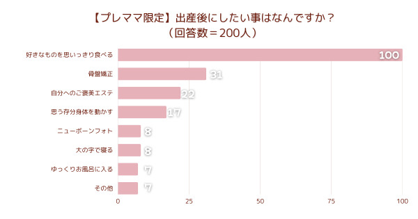 「【プレママ限定】出産後にしたい事はなんですか?」とアンケート調査した結果、1位は『好きなものを思いっきり食べる』でした。